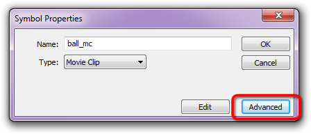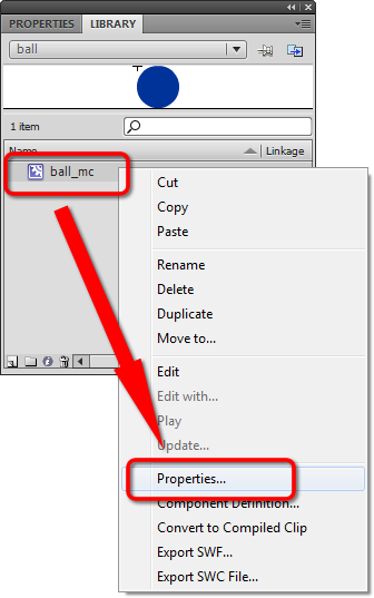 Bring up the Library window (CTRL+L is your keyboard shortcut). Right-Click your ball_mc MovieClip and select Properties: