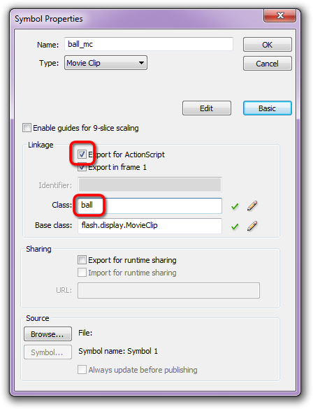 - Select the Export for ActionScript checkbox