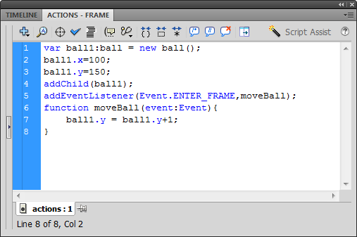 Now test your work. There it goes... moving on down 1 pixel at a time, 24 times per second. Remember the Flash coordinate system inverts the Y axis, so as the value of Y increases, the object moves down not up: