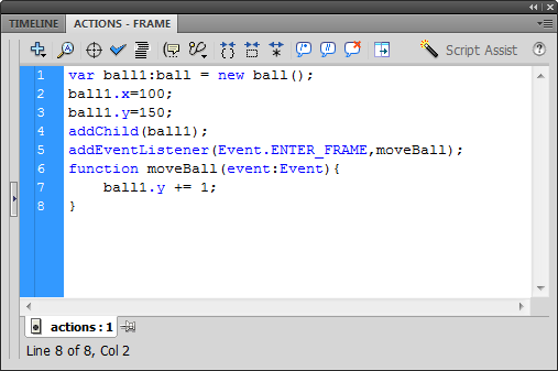 Which is like saying: "Set the Y position of ball1 to the y position of ball1 plus 1." That can be confusing until you get accustomed to it! Don't get too caught up reading these equation strictly left to right. If we evaluate the right side of the equation first, we find we are asking Flash to lookup the value of ball1.y, which will return a number. Then we add 1 to that number.