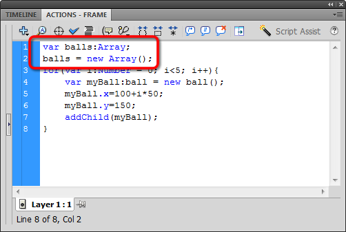 Let's start by opening the ball_for.fla we've been working on. We may want to go back in case we ruin it, so click File > Save As and name our new file: ball_array