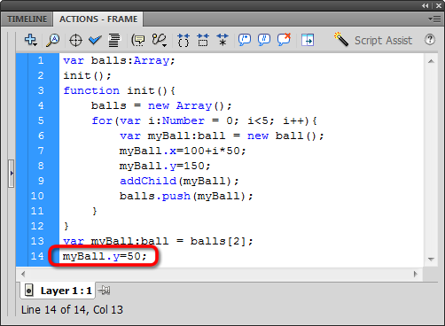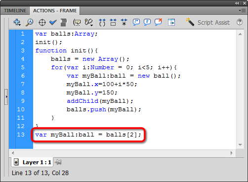 Let's make some stuff happen outside the init function. First, we create a variable we can use to reference our third ball object (balls[2]):