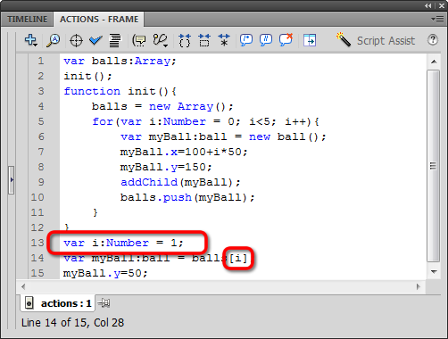 Let's see if we can change that hard number in the balls index into a into a variable called i. Again, we can re-use that variable name because our original "i" is part of the init function: