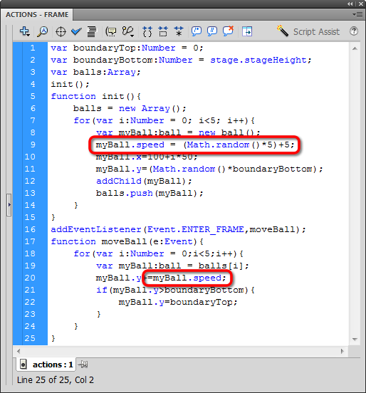 This is just slightly different than the last time we used Math.random. The first part of our equation is familiar: Math.random()*5 will generate a random number between 0 and 4. Since I don't want any balls to just sit there, myBall.speed shouldn't ever equal 0. So, we add 5 to that product. Now we'll get a number between 5 and 9.